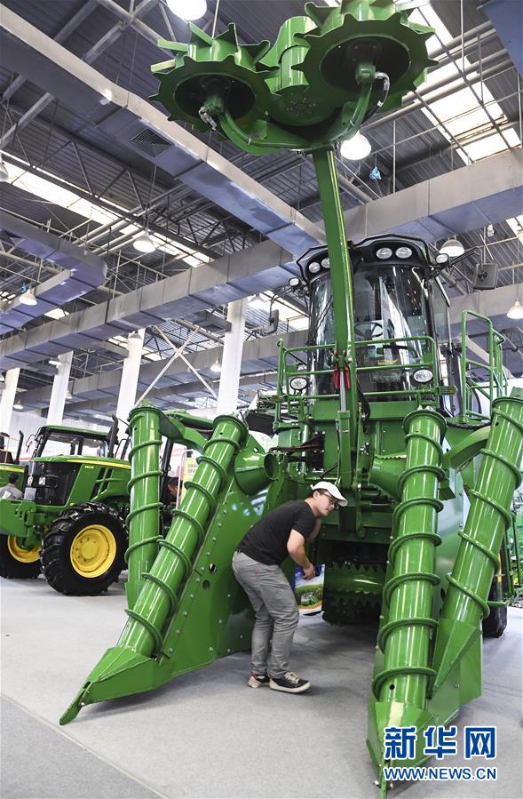 11月16日,参观者在展会现场参观甘蔗收割机械设备。新华社记者曹祎铭摄