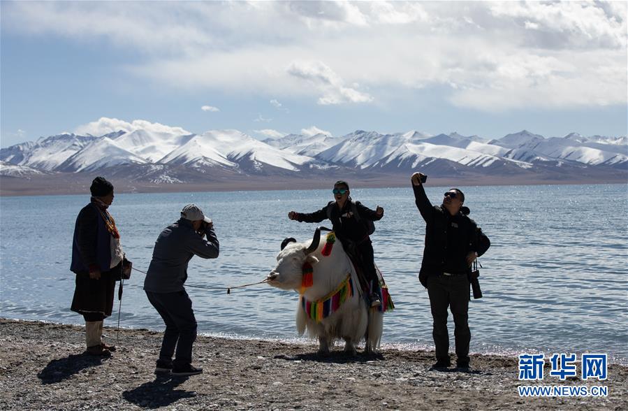 游人在西藏纳木错湖边留影(10月28日摄)。新华社记者江宏景摄