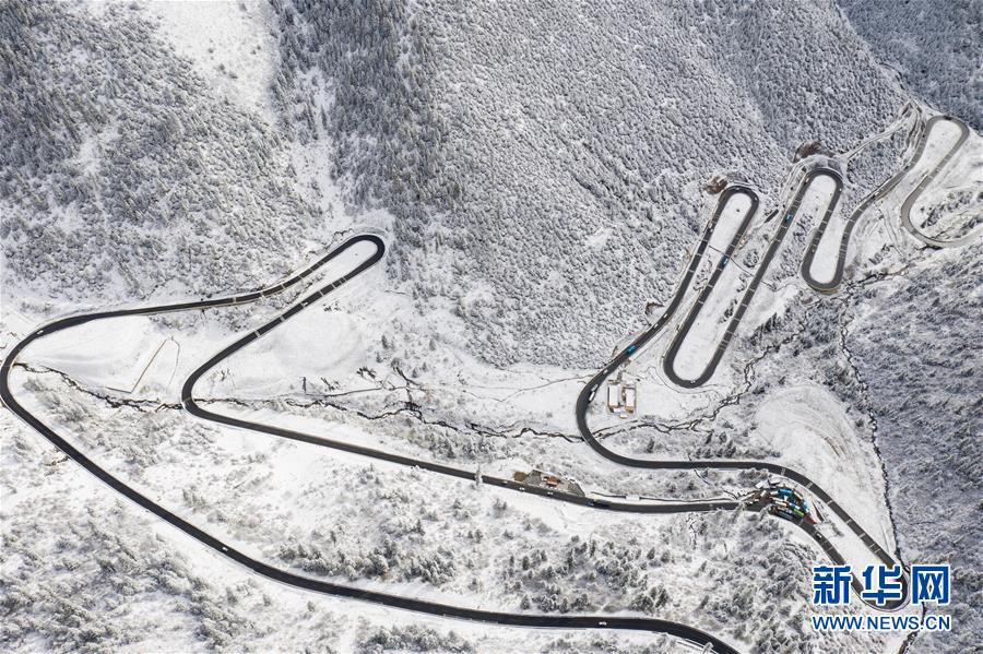 这是318国道剪子弯山段,大雪过后银装素裹(10月17日无人机拍摄)。新华社记者江宏景摄