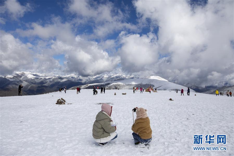 在318国道四川卡子拉山垭口,游人在雪地里留影、嬉戏(10月17日摄)。新华社记者江宏景摄