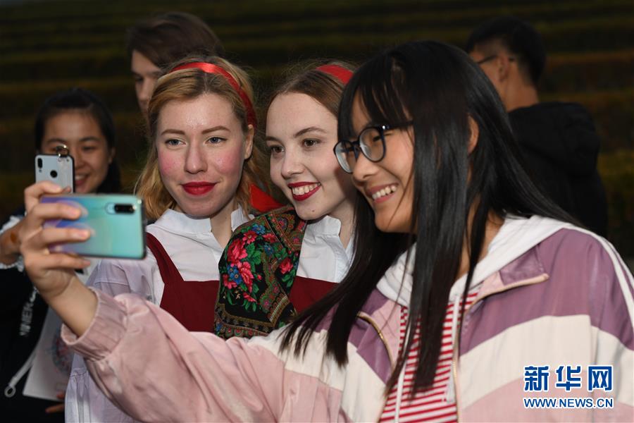 11月17日,来自俄罗斯的留学生在国际文化节上与观众合影。新华社记者 张端 摄