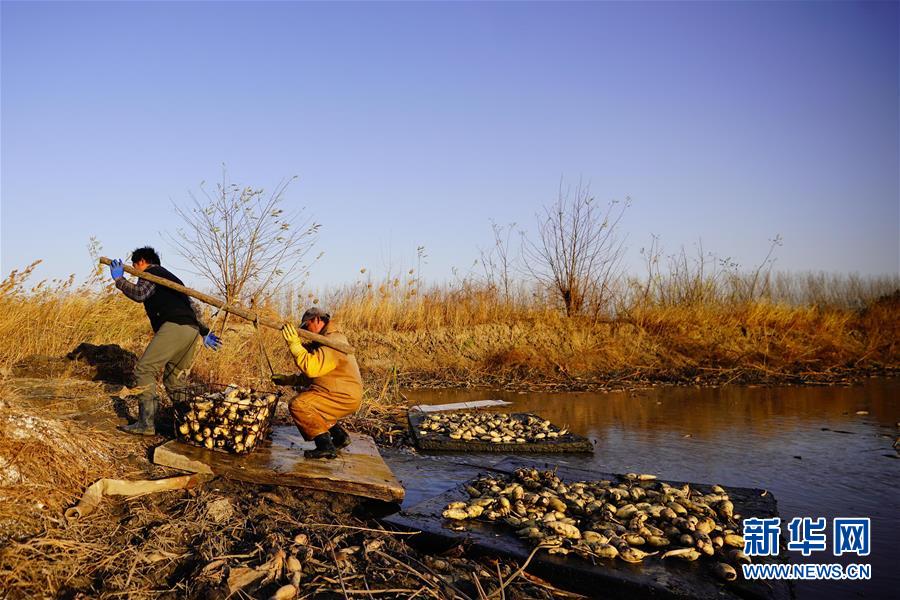 11月18日,工人在采收莲藕。初冬时节,河北省唐山市曹妃甸莲藕丰收,工人们在结冰之前忙着采收莲藕。新华社记者杨世尧摄