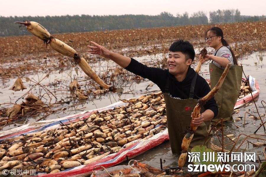 2018年10月14日,江苏宿迁,泗洪县曹庙乡瓦庙村村民在藕虾共作基地参加挖藕比赛。