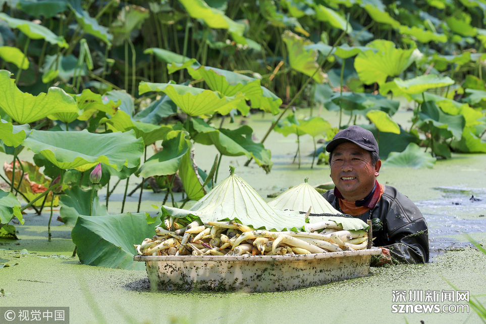 2018年7月25日,江苏淮安,种植户在挖藕带。