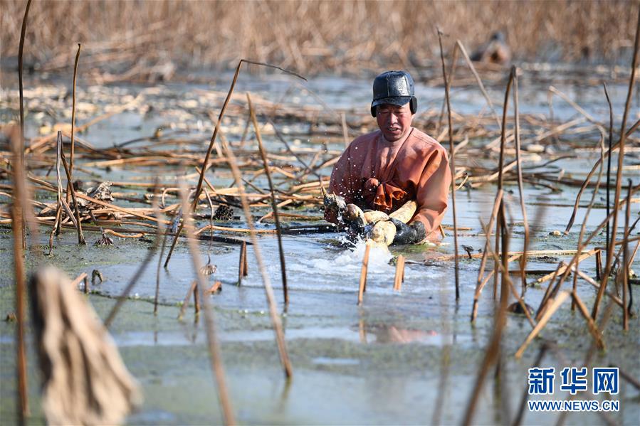 来自淮南的挖藕人王公平在肥西县丰乐镇一莲藕种植基地收获莲藕。新华社记者刘军喜摄