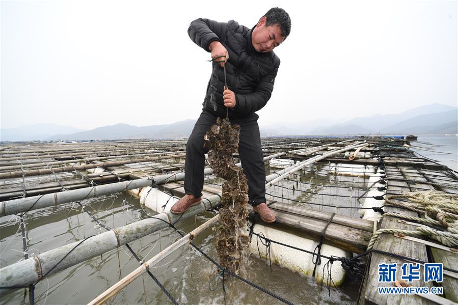 宁德福安市溪邳村村民在查看海上养殖的牡蛎(3月7日摄)。新华社记者姜克红摄