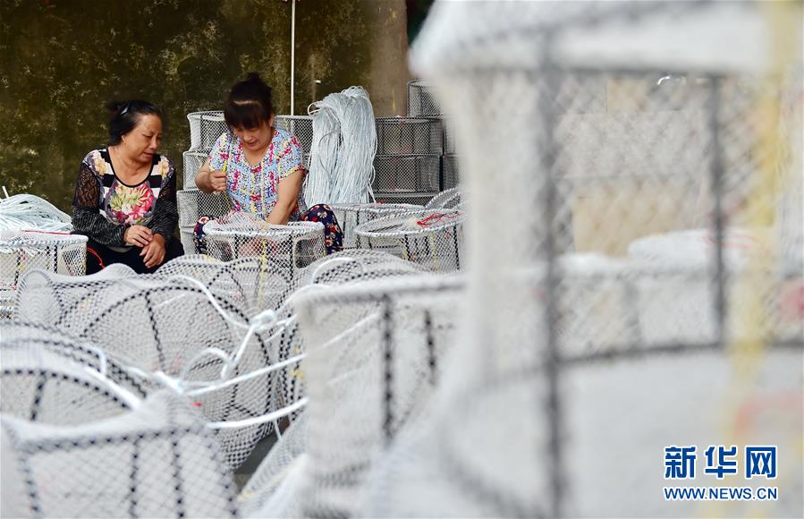 8月22日,福安市下岐村村民在织渔网。新华社记者林善传摄