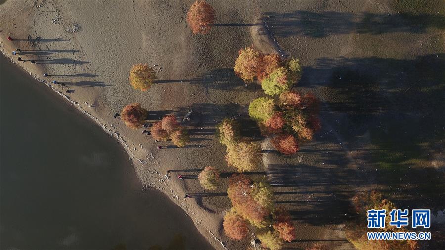 11月14日,游客在奇墅湖边拍照(无人机拍摄)。新华社记者张端摄