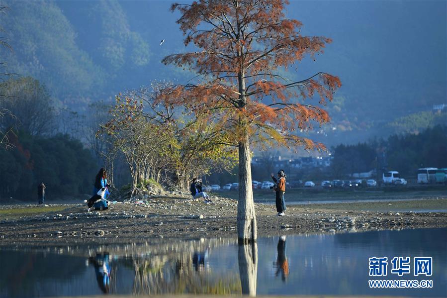 11月14日,游客在奇墅湖边拍摄风光。 初冬时节,安徽省黄山市黟县奇墅湖晨雾缥缈,别具韵味。新华社记者刘军喜摄