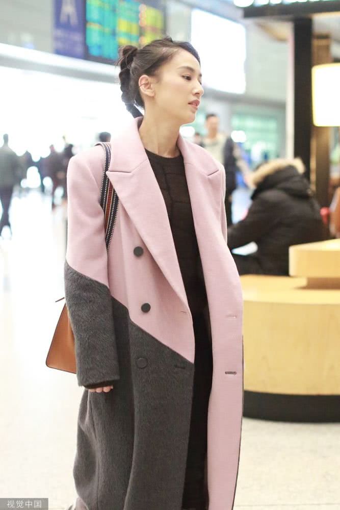 她穿大衣皮靴推行李箱满满商务范,扎小辫子五官清丽气质优雅。
