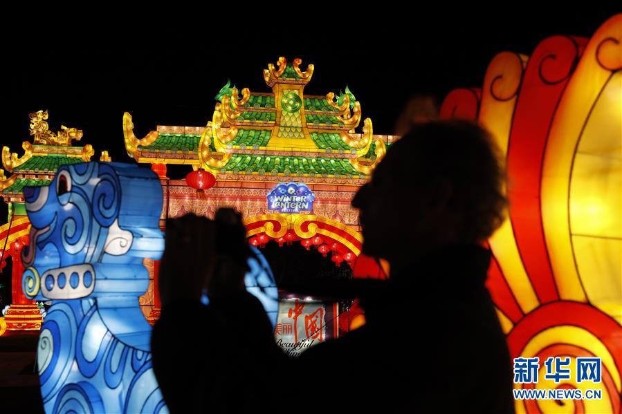 11月20日,在美国纽约斯塔滕岛,游客在第二届纽约花灯游园会上赏灯。当日,第二届纽约花灯游园会在美国纽约斯塔滕岛开幕,50余组各类花灯照亮夜空,吸引观众前来赏灯游玩。新华社记者李木子摄