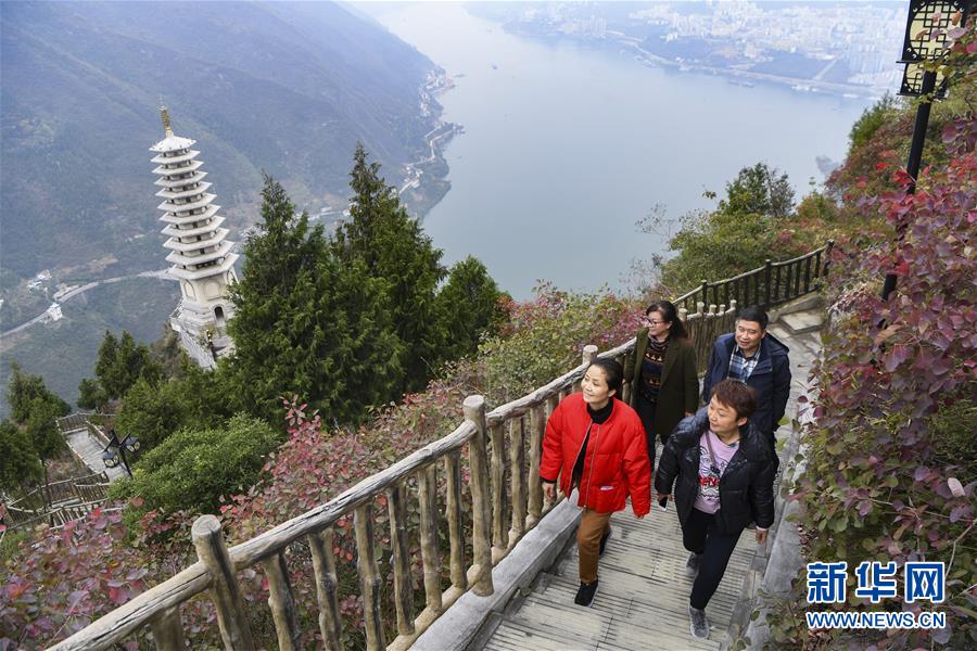 11月23日,游客在位于长江巫峡段的巫山文峰景区游览。初冬时节,位于重庆巫山县境内的长江巫峡段呈现出一江碧水东流、两岸层林尽染的秀美景象。新华社记者王全超摄