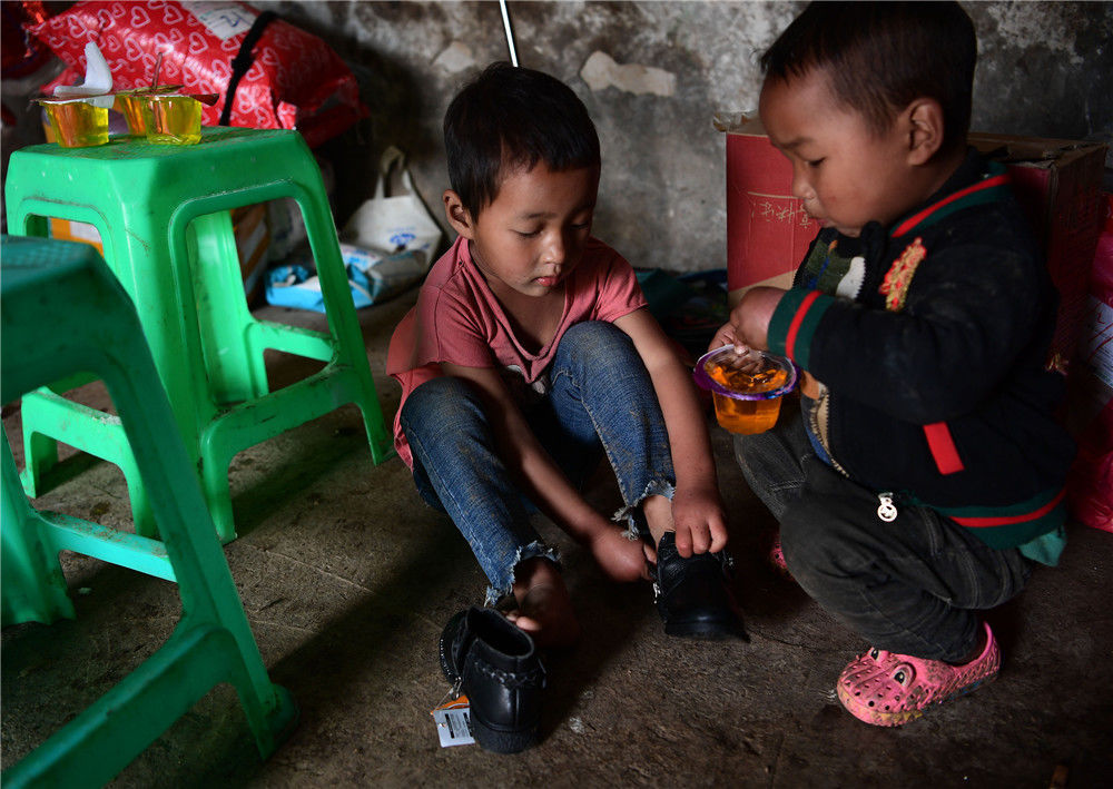 2019年11月16日,四川凉山,回到家,杨阳的女儿杨英(左)就迫不及待地试穿新鞋。