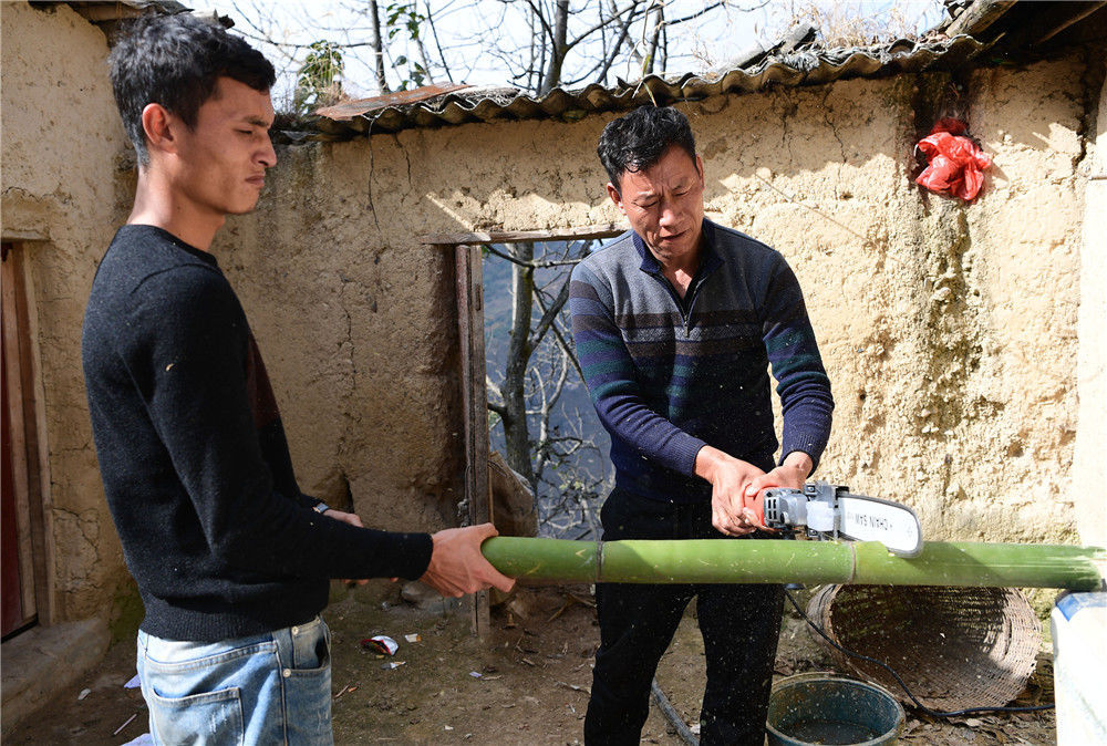 2019年11月16日,四川凉山,装好电锯后,杨阳的父亲某色苏拉泽开始试用起来。