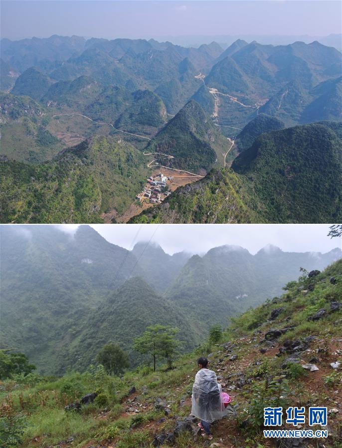 拼版照片:上图为刚刚修通公路的大化瑶族自治县板升乡八好村弄麻屯(11月11日无人机拍摄);下图为在尚未通路的八好村弄麻屯,孩子们爬山路回家(2016年9月23日摄)。新华社记者黄孝邦摄