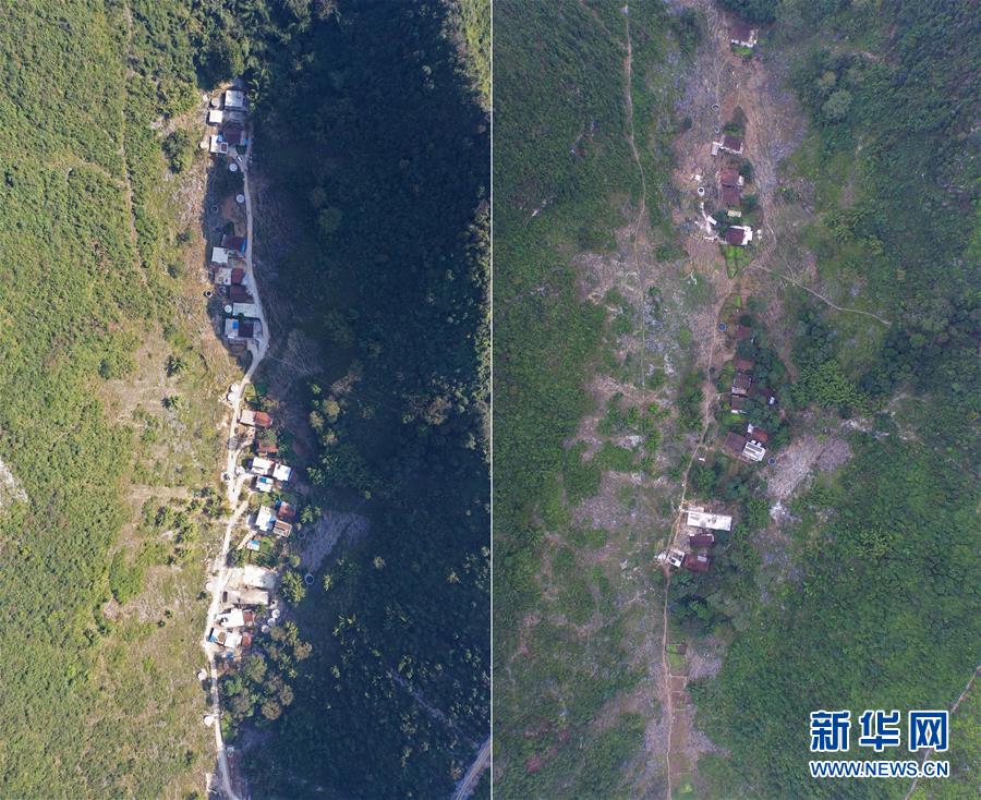 拼版照片:左图为刚刚修通水泥路的大化瑶族自治县板升乡八好村弄研屯(11月11日无人机拍摄);右图为尚未通路的八好村弄研屯(2015年11月3日无人机拍摄)。新华社记者黄孝邦摄