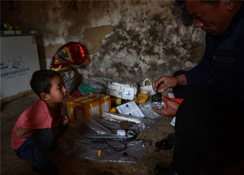 2019年11月16日,四川凉山,杨阳的父亲某色苏拉泽正在安装电锯。