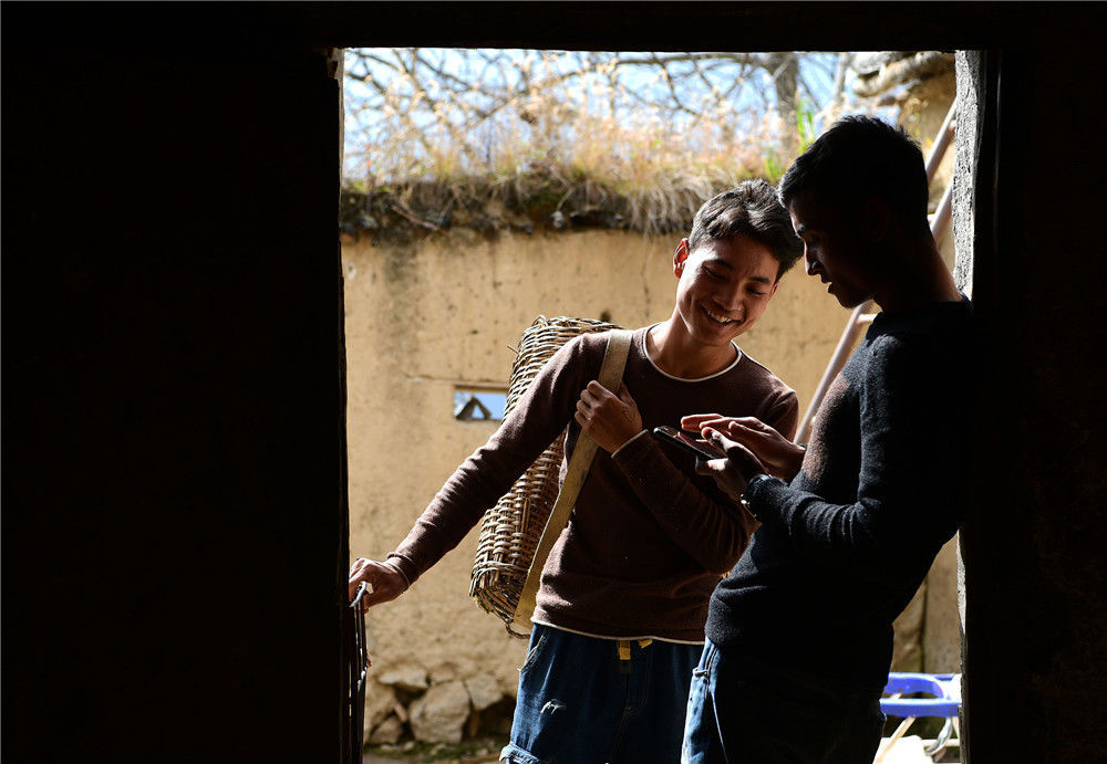 2019年11月16日,四川凉山,村里的年轻人一起交流购物经验。
