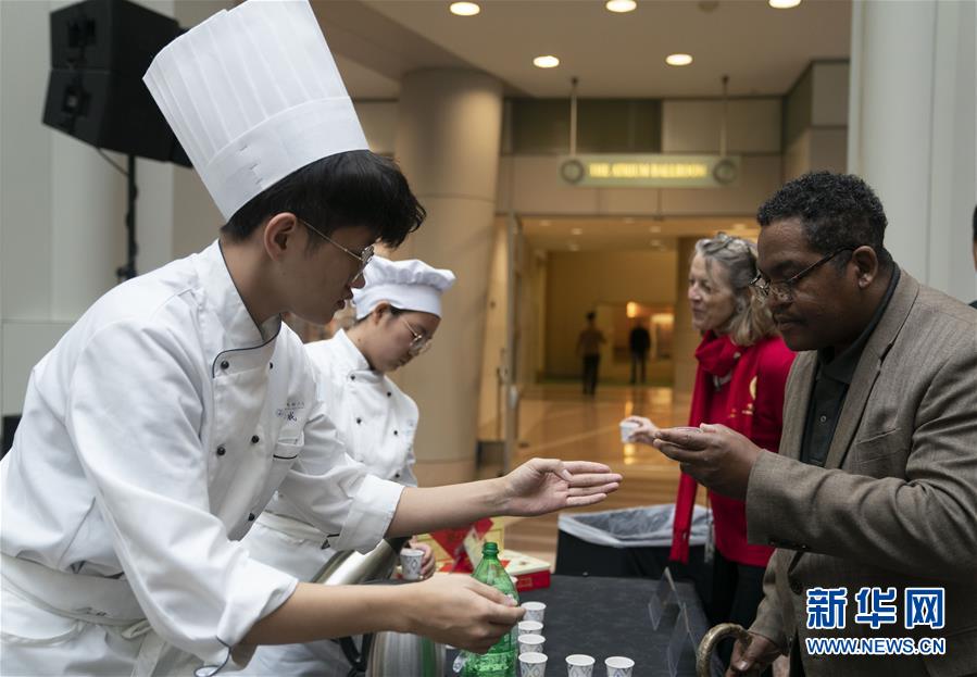 11月22日,在美国华盛顿,人们在“北京日”文化庙会活动上品尝中国小吃。作为中国北京和美国首都华盛顿缔结友好城市35周年庆祝活动的一部分,“北京日”文化庙会22日在华盛顿罗纳德·里根大厦和国际贸易中心举行。新华社记者刘杰摄