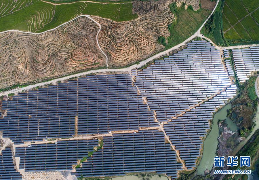 空中俯瞰湖州市埭溪镇东红村的光伏发电站(9月26日无人机拍摄)。新华社记者徐昱摄