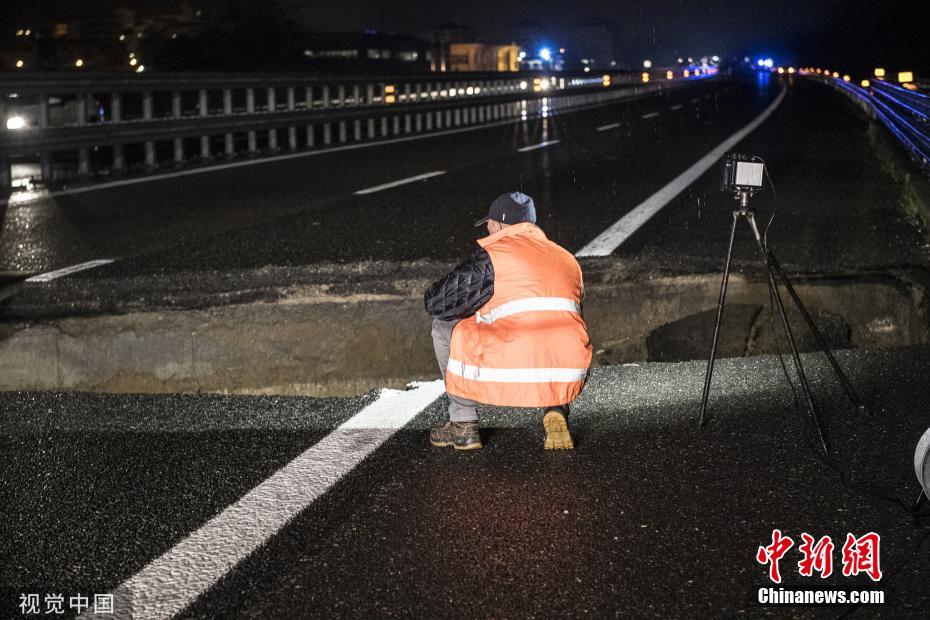 当地时间2019年11月24日,意大利Villafranca dAsti,意大利遭受恶劣天气和持续多日的暴雨,通往都灵方向的A21高速公路路面出现“大坑”。图片来源:视觉中国