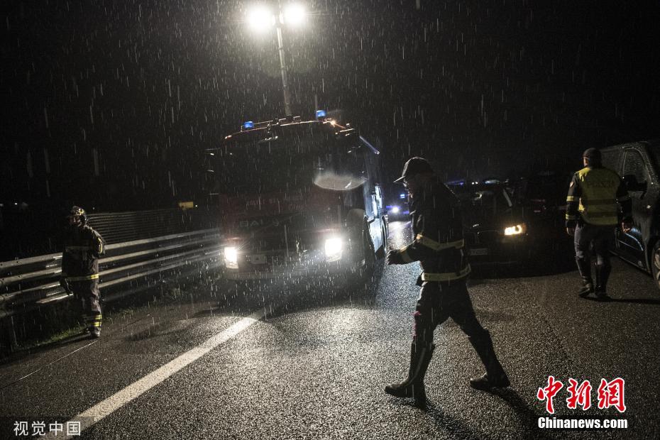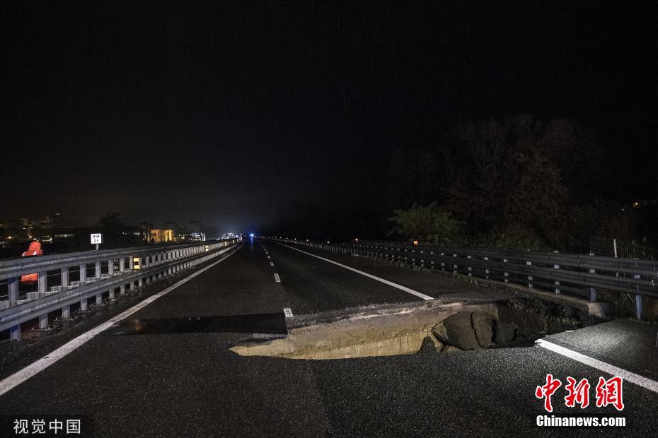 当地时间2019年11月24日,意大利Villafranca dAsti,意大利遭受恶劣天气和持续多日的暴雨,通往都灵方向的A21高速公路路面出现“大坑”。图片来源:视觉中国