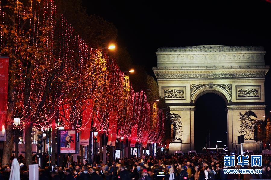 11月24日,在法国巴黎,人们在香榭丽舍大街上参加点灯仪式。当日,法国巴黎香榭丽舍大街点亮彩灯迎圣诞。从即日起至1月8日,整条香榭丽舍大街都将被喜庆的节日灯饰点亮。新华社记者高静摄