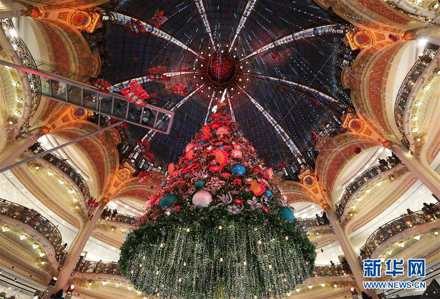 这是11月24日在法国巴黎老佛爷百货公司拍摄的点灯后的巨型圣诞树。 新华社记者高静摄