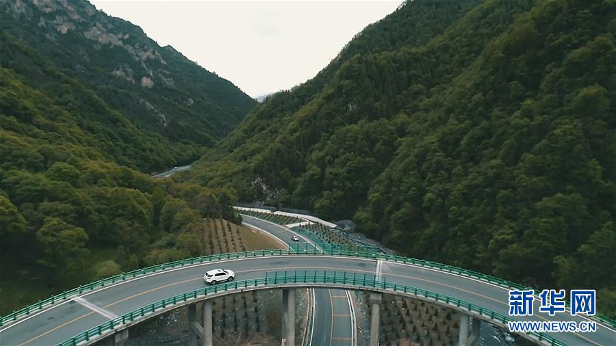 6月11日,一辆汽车在青海省扎隆沟至碾伯镇公路上行驶(无人机拍摄)。新华社记者张宏祥摄