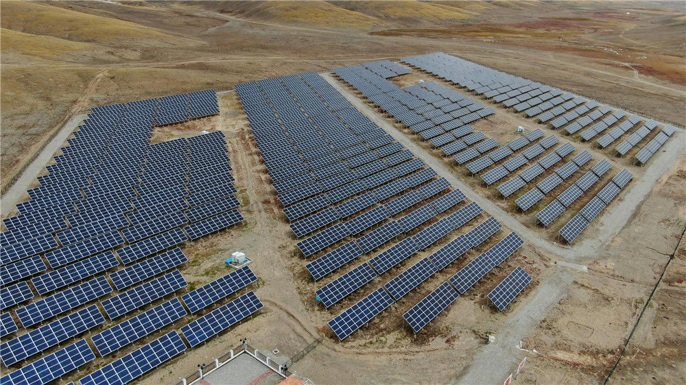 2019年10月10日,位于青海省果洛藏族自治州玛多县境内的中国海拔最高村级光伏扶贫电站。