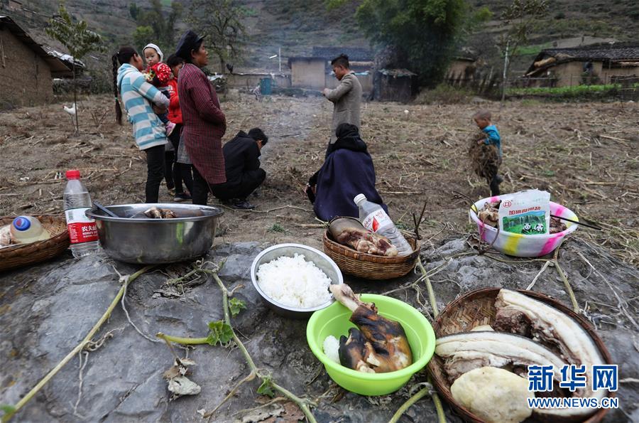 11月24日,在昭觉县支尔莫乡阿土列尔村,当地居民准备熟食、酒等食物祭祖,并相互赠送。11月20日至26日是四川省凉山彝族自治州大小凉山彝族群众传统节日——彝族年,悬崖上的阿土列尔村的彝族群众杀年猪、祭祀和走亲拜年,庆祝一年一度的彝族年。阿土列尔村是“悬崖村”,位于四川省凉山彝族自治州昭觉县支尔莫乡,坐落在海拔1400-1600米山坳中,这里居住着60多户彝族群众,村民走出大山,需要攀爬悬崖。新华社记者江宏景摄
