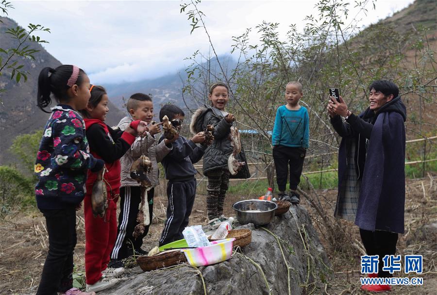 11月24日,在昭觉县支尔莫乡阿土列尔村,村民阿牛用手机拍摄孩子们向大家拜年的视频。新华社记者江宏景摄