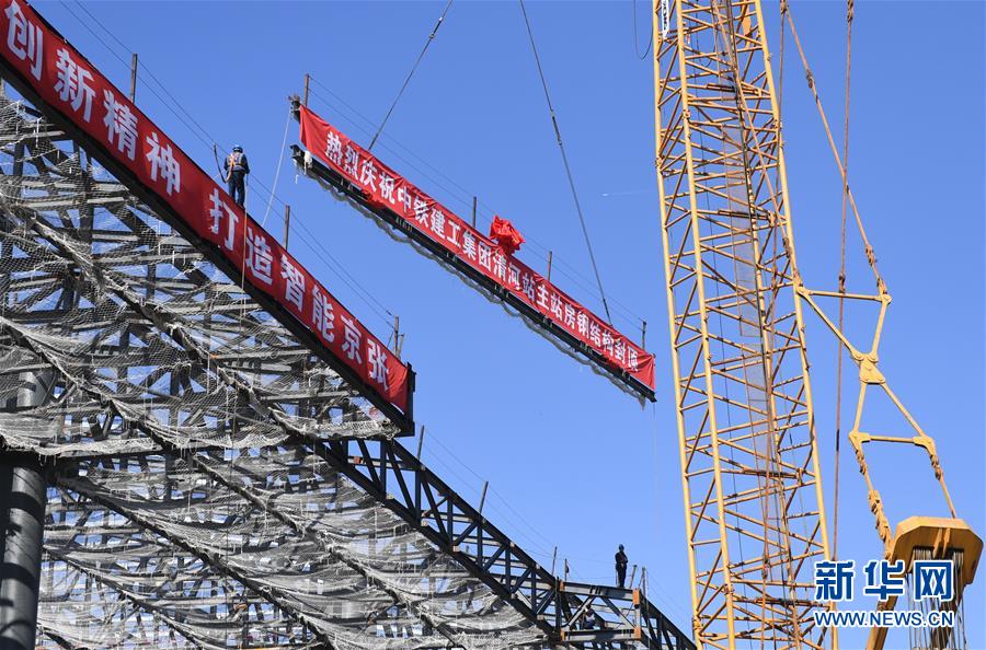 10月17日,工作人员在吊装最后一组钢梁。新华社记者张晨霖摄