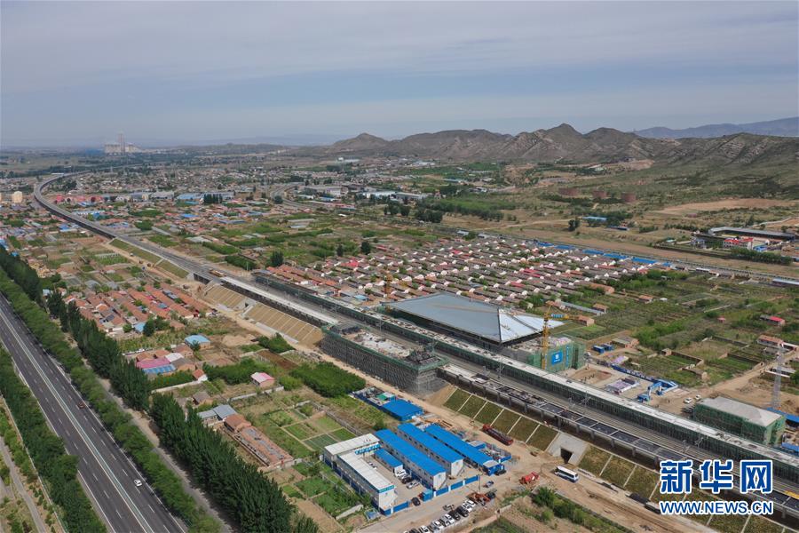 建设中的宣化北站(5月30日无人机拍摄)。京张高铁宣化北站位于河北省张家口市宣化区北盆儿窑村附近,京张高铁线路北侧,目前该站已完成站房主体结构、钢结构、金属屋面、清水混凝土雨棚结构等施工内容,全面进入装饰装修施工阶段。新华社记者邢广利摄