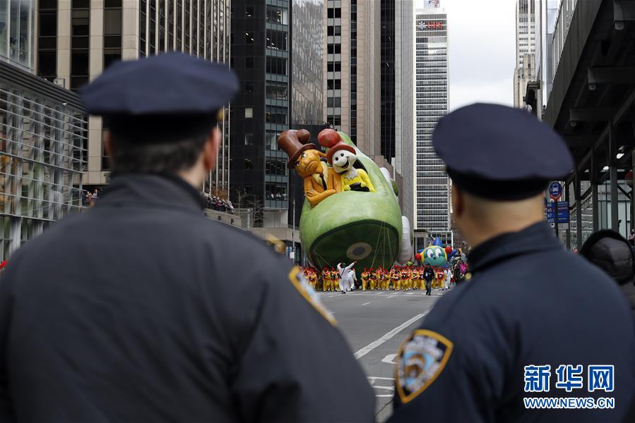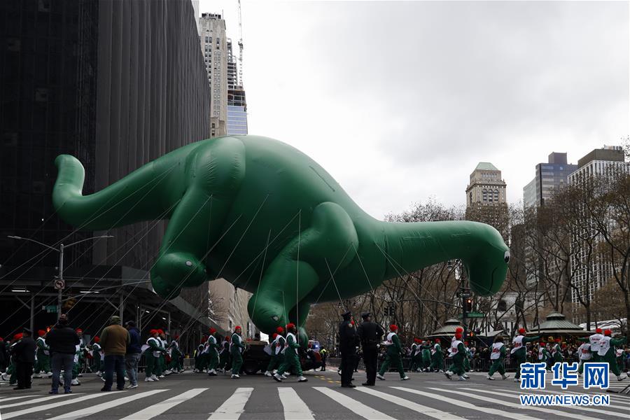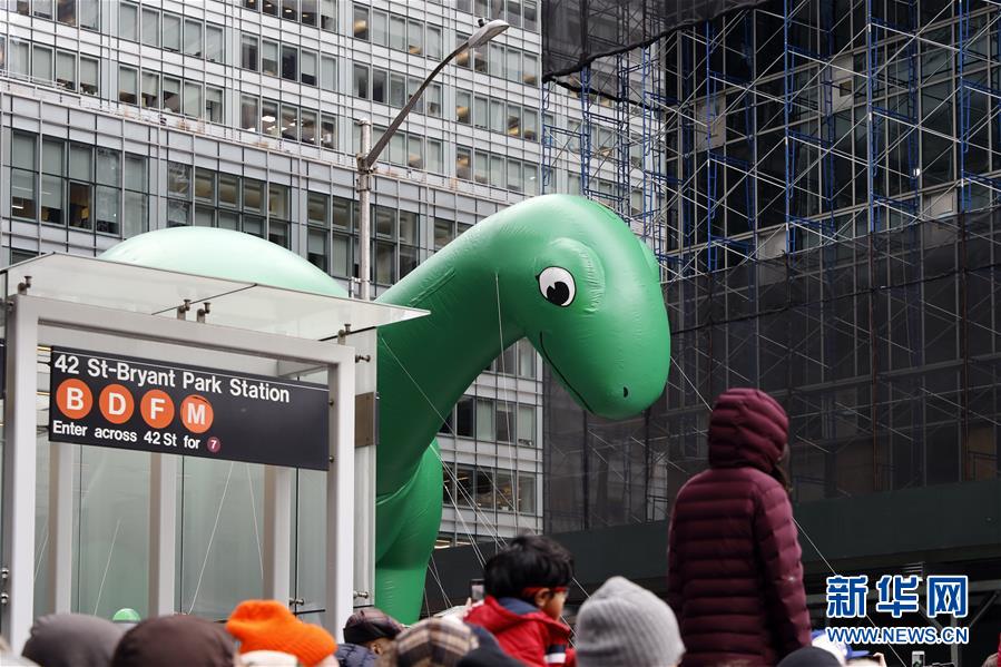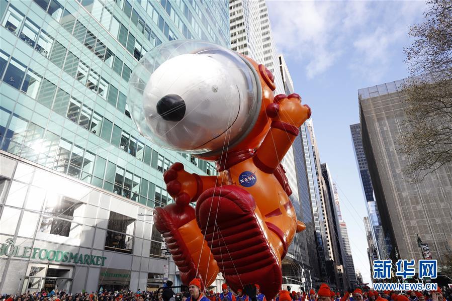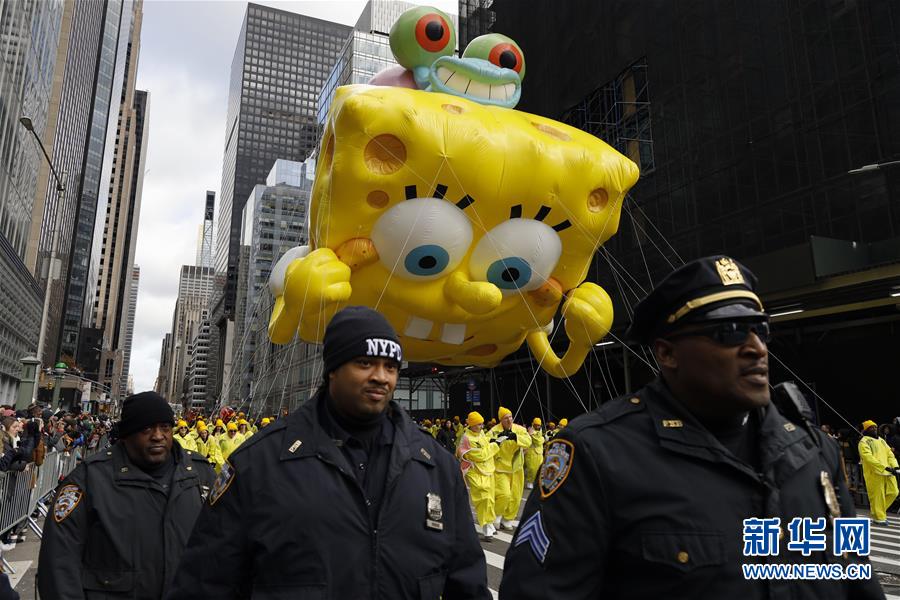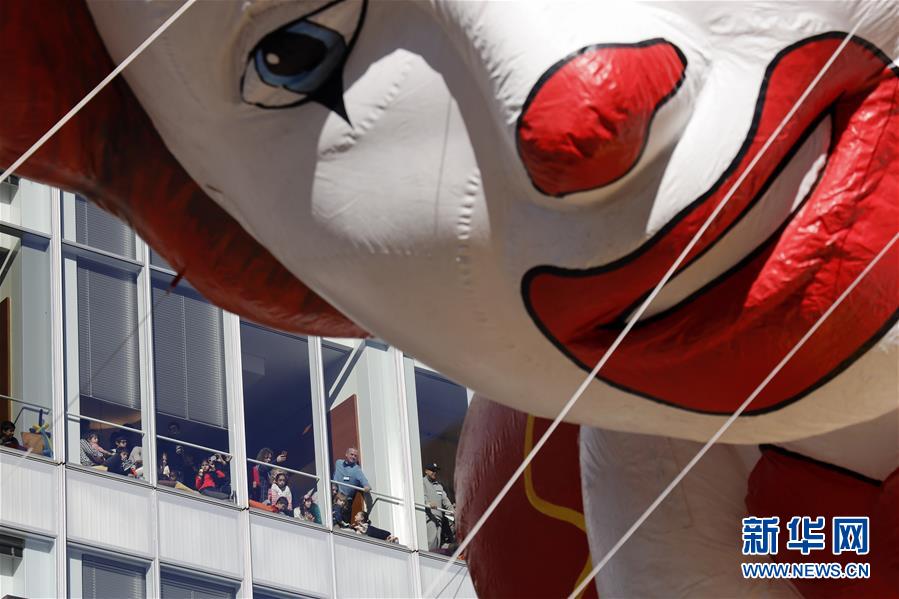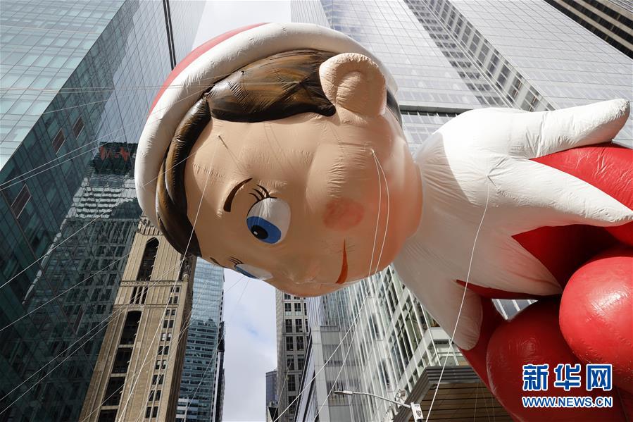 11月28日,在美国纽约举行的感恩节大游行上,卡通气球行进在曼哈顿街头。 新华社记者 李木子 摄
