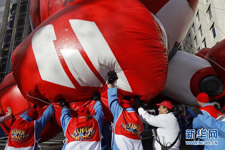 11月28日,在美国纽约举行的感恩节大游行上,工作人员试图控制气球。 新华社记者 李木子 摄