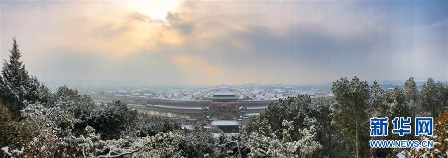 这是11月30日在北京景山公园万春亭拍摄的雪后故宫(手机全景模式拍摄)。 新华社记者 沈伯韩 摄