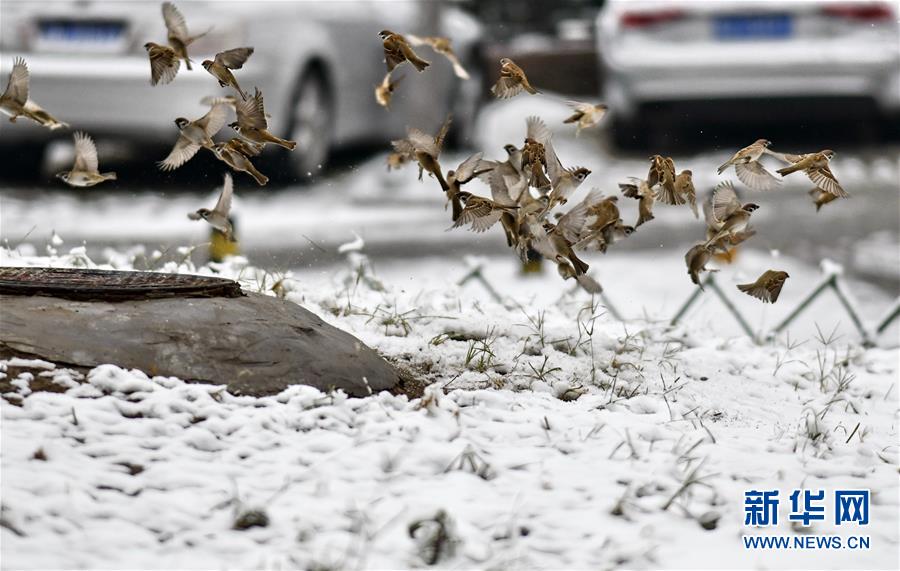 11月30日拍摄的在雪中觅食的麻雀。 新华社记者 李欣 摄
