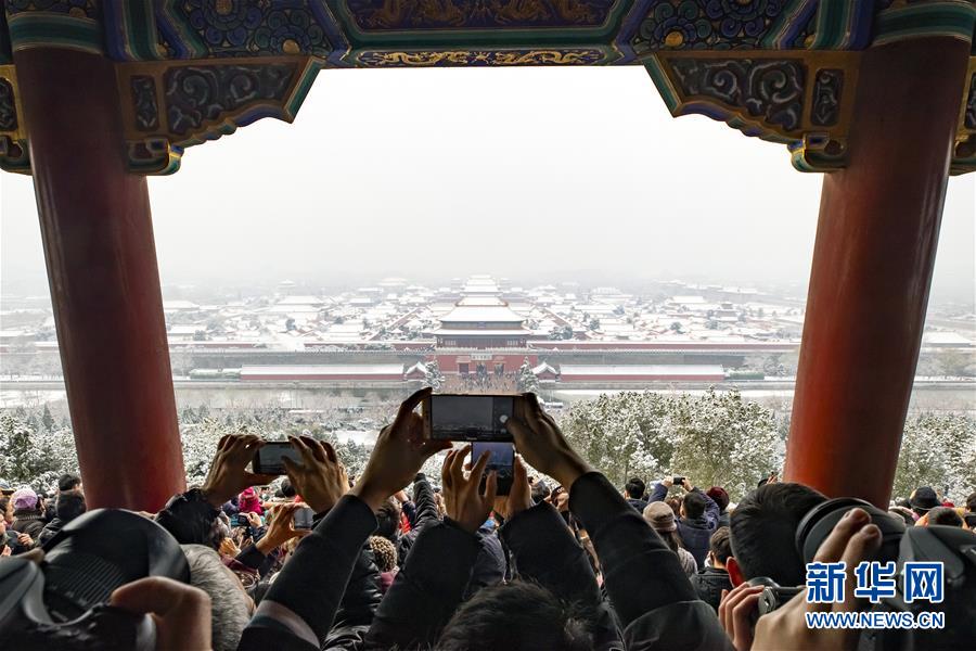 11月30日,人们在北京景山公园的万春亭拍摄雪后的故宫。 新华社记者 沈伯韩 摄