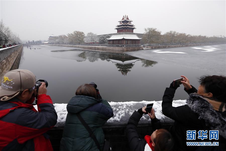 11月30日,人们在雪后的故宫角楼附近拍照。 新华社记者 沈伯韩 摄
