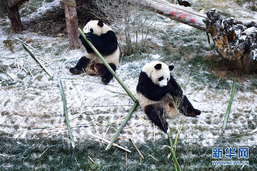 11月29日,在西宁熊猫馆内,两只大熊猫在吃竹子。 当日,青海省西宁市迎来降雪,西宁熊猫馆四只“萌宠”大熊猫在雪天里享受着吃竹子的乐趣。据了解,大熊猫生活的适宜温度在26摄氏度至零下5摄氏度之间,冬季气温低于零下5摄氏度时,场馆会启用保暖设施。 新华社记者 吴刚 摄