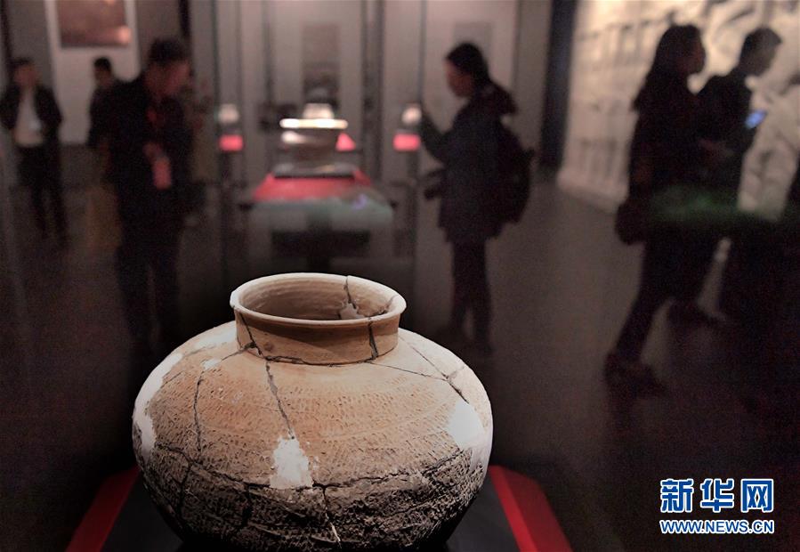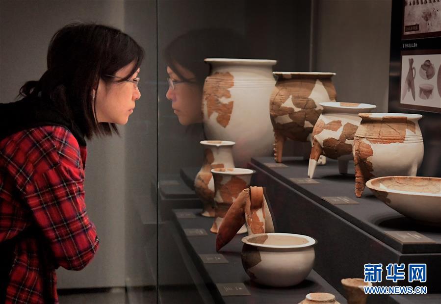 10月19日,参观者在二里头夏都遗址博物馆内观看展出的陶器。新华社记者李安摄