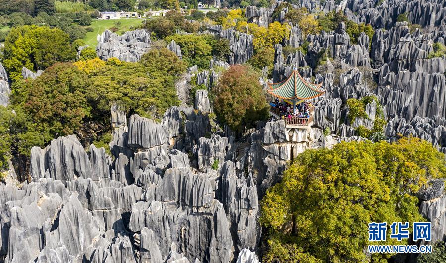 11月28日,游客在石林景区游览(无人机拍摄)。新华社记者江文耀摄