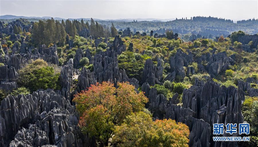 11月28日,游客在石林景区游览(无人机拍摄)。新华社记者江文耀摄