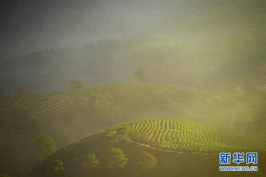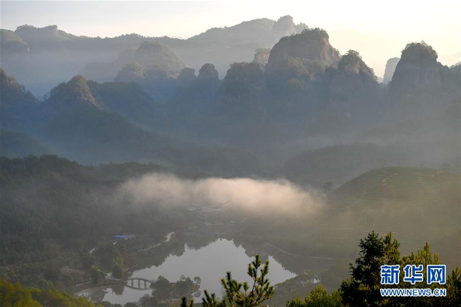 福建省武夷山的茶山云雾缭绕,在朝阳照射下如梦如幻(11月17日摄)。新华社记者宋为伟摄