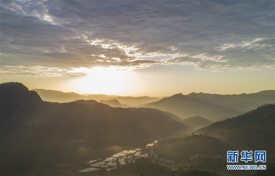 这是福建省武夷山的山水田园风光(11月17日无人机拍摄)。初冬时节,福建省武夷山绿意依旧,茶园、山峦、村落在朝霞的映衬下美不胜收,呈现出一派怡然秀丽的山水田园风光。新华社记者宋为伟摄