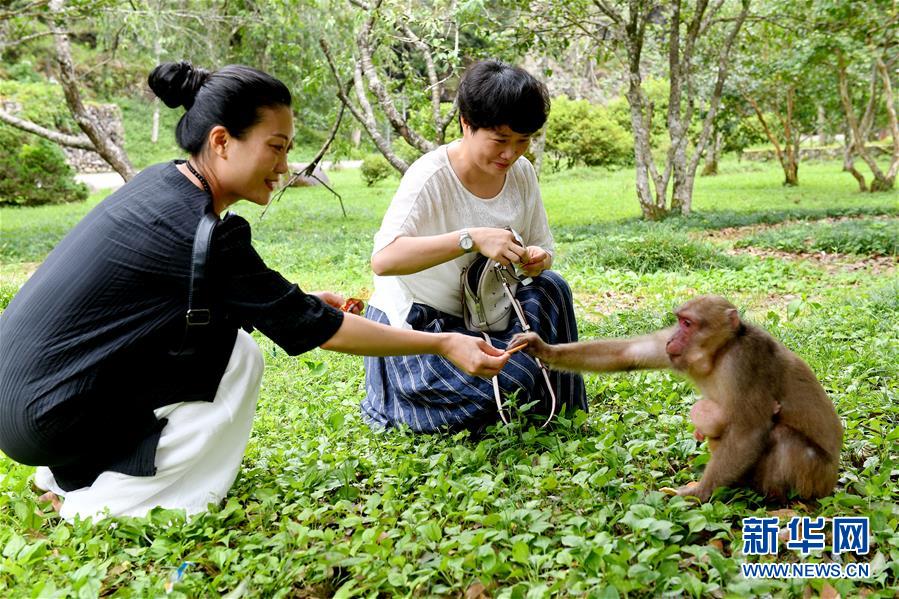 游客在武夷山自然保护区喂猴(7月20日摄)。新华社记者张国俊摄