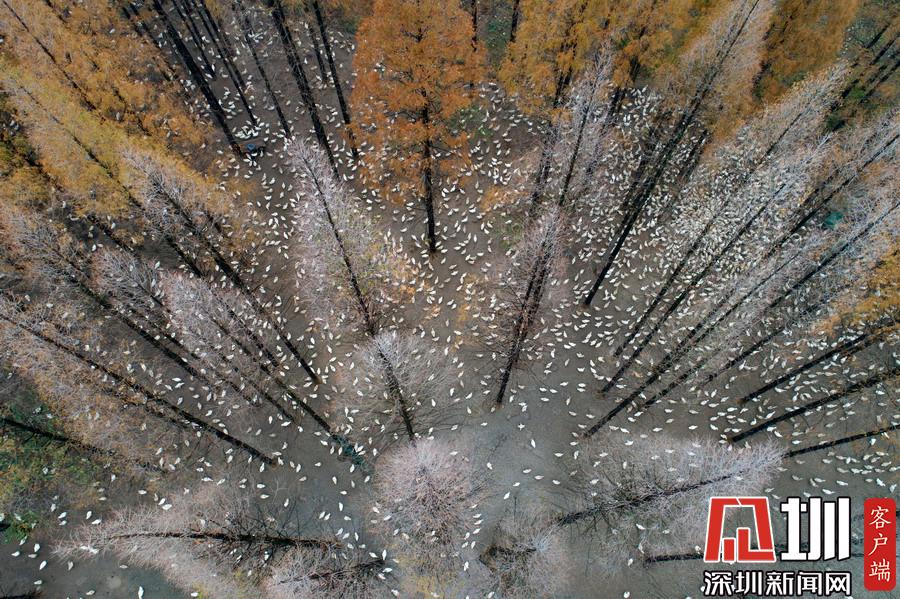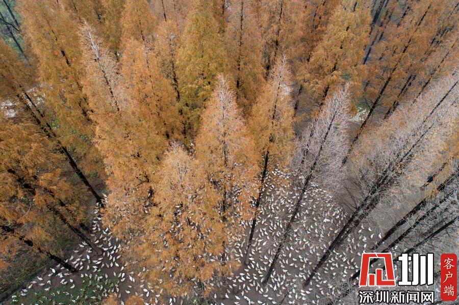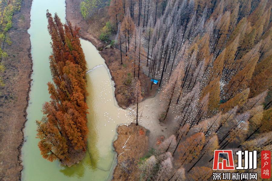 2019年12月1日,江苏省宿迁市泗洪县,航拍5000多只四季鹅在陈圩林场的树林下吃食的壮观场景。