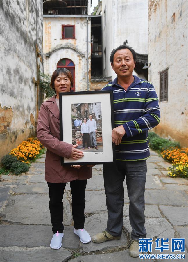 篁岭村村民曹根旺夫妇拿着2010年自己的老照片在家门前留影(11月7日摄)。新华社记者胡晨欢摄