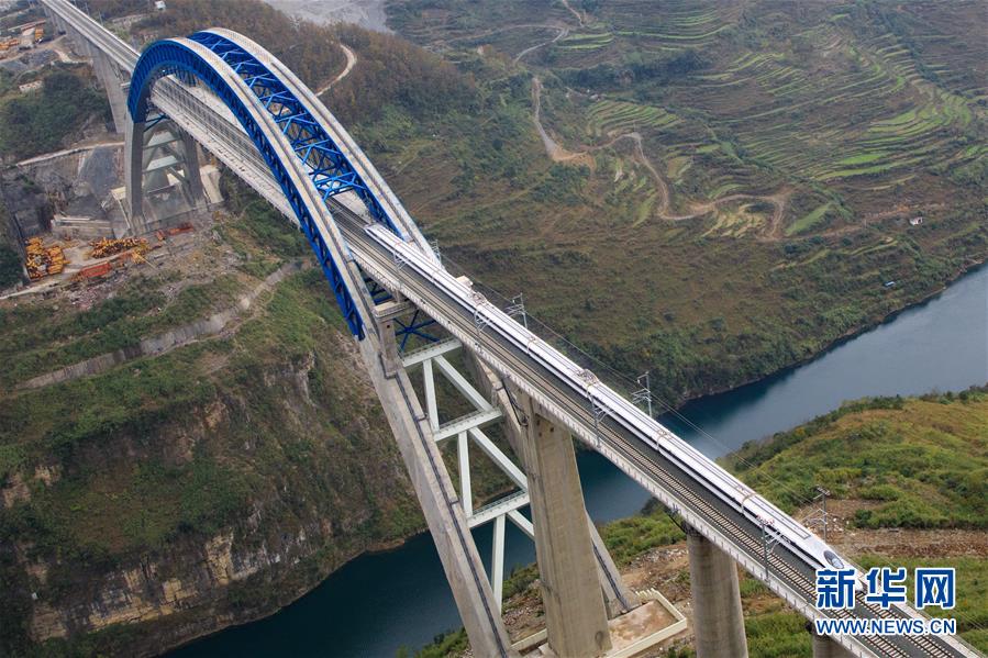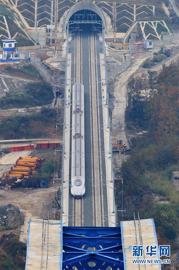 12月2日,一辆试验列车驶过成贵高铁鸭池河特大桥。当日,正在进行联调联试的成贵高铁进入全线拉通空载模拟运行阶段,试验列车将在成都到贵阳区间内全线路运行。线路全长650公里的成贵高铁是我国“八纵八横”高速铁路网的重要组成部分,设计时速为250公里。新华社记者刘续摄